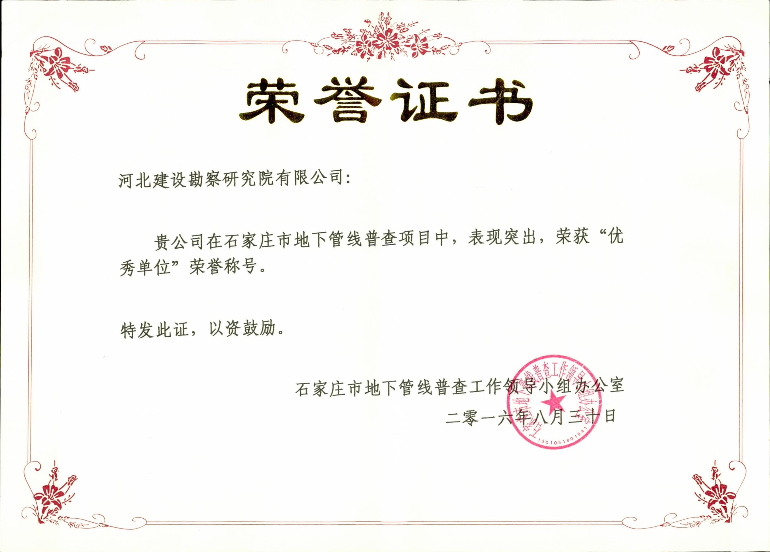 公司承擔(dān)的石家莊市地下管線普查項(xiàng)目于近日完工,并順利通過石家莊市地下管線普查工作領(lǐng)導(dǎo)小組檢查。石家莊市地下管線普查工作領(lǐng)導(dǎo)小組充分肯定了我公司在該項(xiàng)目中取得的成績(jī)和突出的表現(xiàn),特頒發(fā)“優(yōu)秀單位”榮譽(yù)證書,以資鼓勵(lì)。