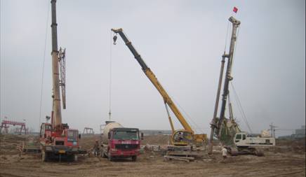 本工程樁基采用后壓漿旋挖鉆孔灌注樁,完成了高效沉降槽、種子過(guò)濾、1#、2#、3#、4#焙燒爐、電除塵、平盤過(guò)濾、預(yù)脫硅槽、高位槽、種子分解、1#、2#、3#、4#冷卻塔、1#、2#、3#鋁粉倉(cāng)、棧橋、堿液調(diào)配、提升機(jī)、礦漿槽和蒸發(fā)器、礦漿槽、蒸發(fā)器、冷卻塔、堿液調(diào)配、預(yù)脫硅槽、高位槽。施工主要內(nèi)容包括:測(cè)量放線、鋼筋籠制作、運(yùn)輸與吊裝、成孔、混凝土攪拌與運(yùn)輸、水下混凝土灌注、后壓漿、渣土清運(yùn)等。共完成直徑1000mm、800mm和600mm的灌注樁共4501根,樁身混凝土為C25和C30兩種,混凝土設(shè)計(jì)方量81773.8m3,實(shí)際灌注方量95288.0m3,平均充盈系數(shù)1.17。