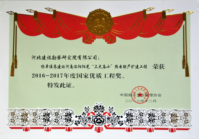 近日,由中國施工企業管理協會組織的2016-2017年度第一批國家優質工程獎評審會在北京隆重召開。國家工程建設質量獎評審組聽取了2016-2017年度第一批國家優質工程獎評審工作報告和專家組長對參評項目復查情況的匯報,對參評項目進行了綜合評議、質詢答辯和記名投票,確定了2016-2017年度第一批國家優質工程獎候選項目。我公司參建的新疆華電喀什熱電有限責任公司的2X350MW熱電聯產工程、河南洛陽陽光“上大壓小”熱電聯產熱電工程最終通過評審榮獲了國家優質工程獎。