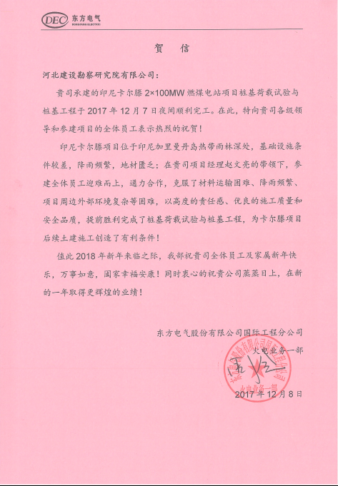 我公司承建的印尼卡爾滕2*100MW燃煤電站項(xiàng)目樁基荷載試驗(yàn)與樁基工程于2017年12月7日夜間順利完工。東方電氣股份有限公司國(guó)際工程分公司發(fā)來(lái)賀信,向我公司項(xiàng)目員工表示祝賀。