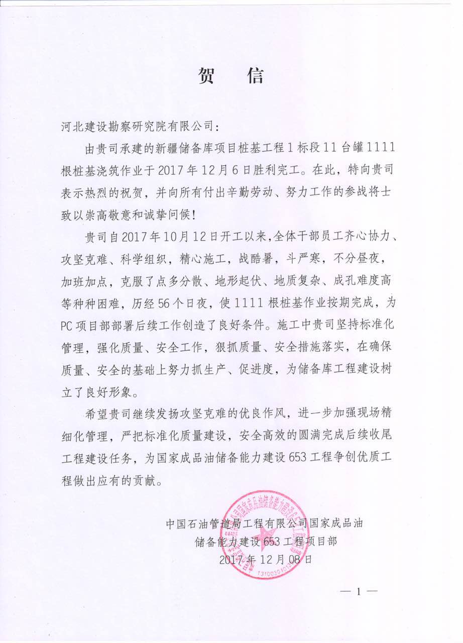 我公司承建的新疆儲備庫項目樁基工程1標段11臺罐1111根樁基澆筑作業于2017年12月6日勝利完工。中國石油管道局工程有限公司國家成品油儲備能力建設653工程項目部發來賀信,對我項目部重安全,重質量的工作作風表示充分地肯定,也對我項目部為儲備庫工程建設樹立良好形象提出了表揚。