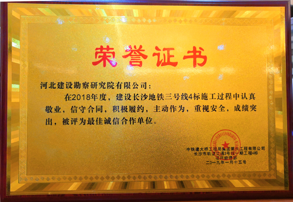 我公司承建的長沙地鐵三號線4標(biāo)施工監(jiān)測項(xiàng)目,自開工以來精心策劃、有效組織、認(rèn)真施工、積極與業(yè)主配合。施工過程中我公司認(rèn)真敬業(yè),信守合同,積極履約,主動作為,重視安全,成績突出,中鐵建大橋工程局集團(tuán)特授予我公司 “最佳誠信合作單位”榮譽(yù)獎牌,以示表彰!