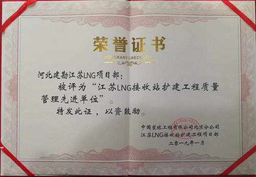 由于我公司的出色表現,總包方中國寰球工程有限公司北京分公司對我公司和個人進行了表彰,授予我公司“質量管理先進單位”和“HSE管理先進單位”,并對周進發、朱凱云、李友峰授予了“優秀項目管理者”稱號,對賈沖、冀紫豪、任書星、李昭、張勇、張旺授予了“質量管理先進個人”稱號,對劉志峰、辛朝友、邢鐸、付嘉嘉、宋江來授予了“HSE管理先進個人”稱號,分別頒發了錦旗、榮譽證書、獎牌。