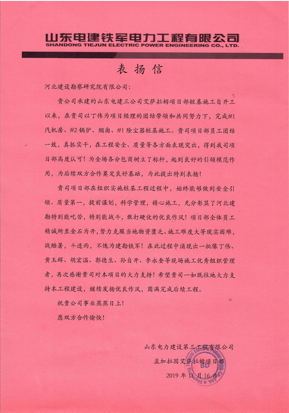 近日,由我公司承建的孟加拉艾薩拉姆項(xiàng)目樁基工程收到總包單位山東電建三公司的表揚(yáng)信,經(jīng)過項(xiàng)目部全體員工的辛勤付出,得到總包單位的高度認(rèn)可,為后續(xù)雙方合作奠定良好基礎(chǔ)。這充分彰顯了河北建勘人的風(fēng)采,充分體現(xiàn)了河北建勘人的鐵軍精神,充分展示了河北建勘的戰(zhàn)斗力和實(shí)力,為我司業(yè)務(wù)在孟加拉更好更快發(fā)展提供了保證。項(xiàng)目部全體員工一定會珍惜榮譽(yù),珍視公司良好發(fā)展平臺,再接再厲,圓滿完成后續(xù)施工任務(wù)!