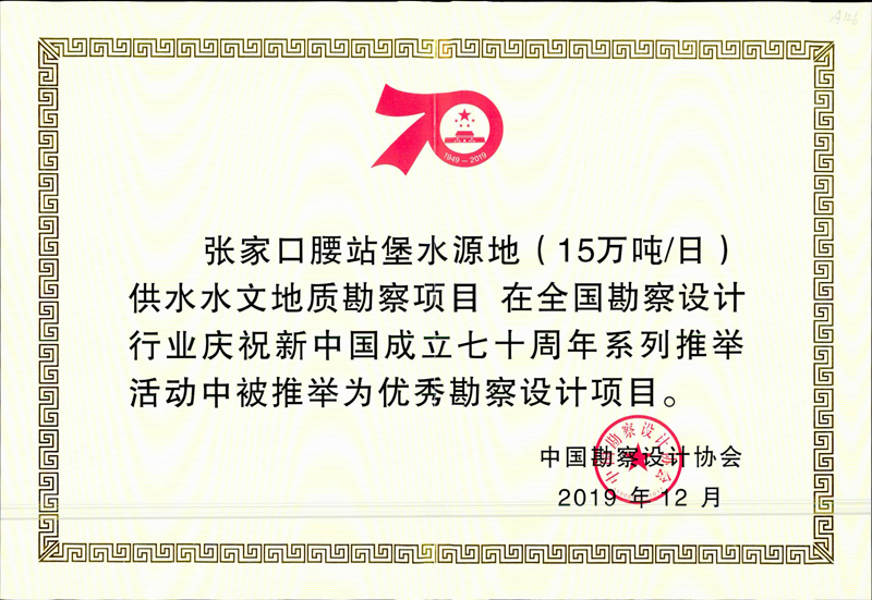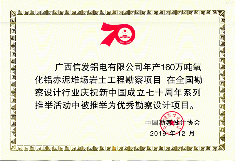 其中,我公司榮獲“優(yōu)秀勘察設(shè)計企業(yè)”榮譽(yù)稱號,董事長韓立君榮獲“優(yōu)秀企業(yè)家”稱號,總工程師聶慶科榮獲“科技創(chuàng)新帶頭人”榮譽(yù)稱號。我公司完成的張家口腰站堡水源地(15萬噸/日)供水水文地質(zhì)勘察項目、廣西信發(fā)鋁電有限公司年產(chǎn)160萬噸氧化鋁赤泥堆場巖土工程勘察項目被推舉為優(yōu)秀勘察設(shè)計項目。