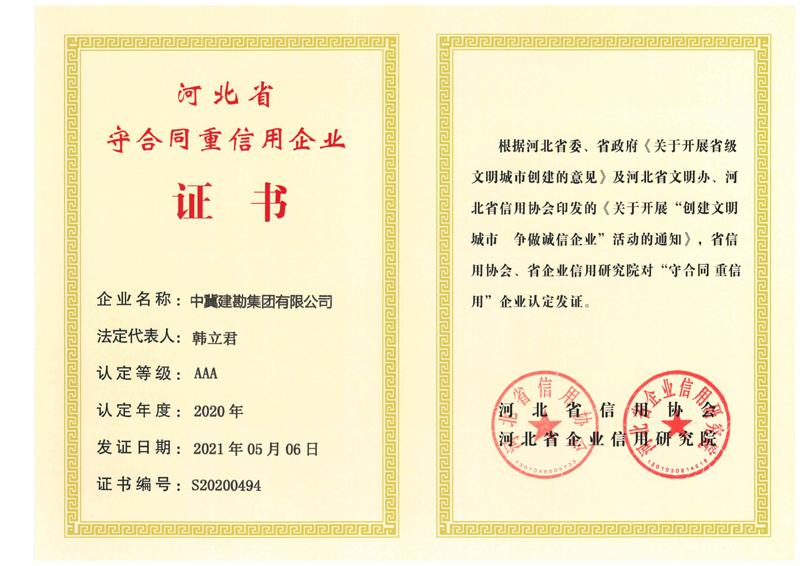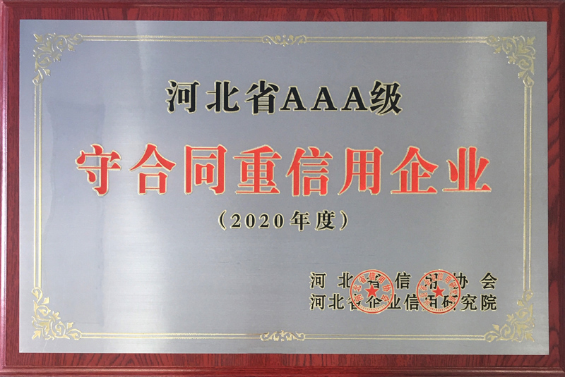 根據(jù)河北省信用辦、河北省信用協(xié)會等七部門印發(fā)的《關(guān)于開展“推進誠信建設(shè)共建信用河北”的活動方案》的通知,河北省信用協(xié)會、河北省企業(yè)信用研究院對“守合同重信用”企業(yè)進行認定,我公司繼續(xù)被評定為“河北省AAA級守合同重信用企業(yè)”。