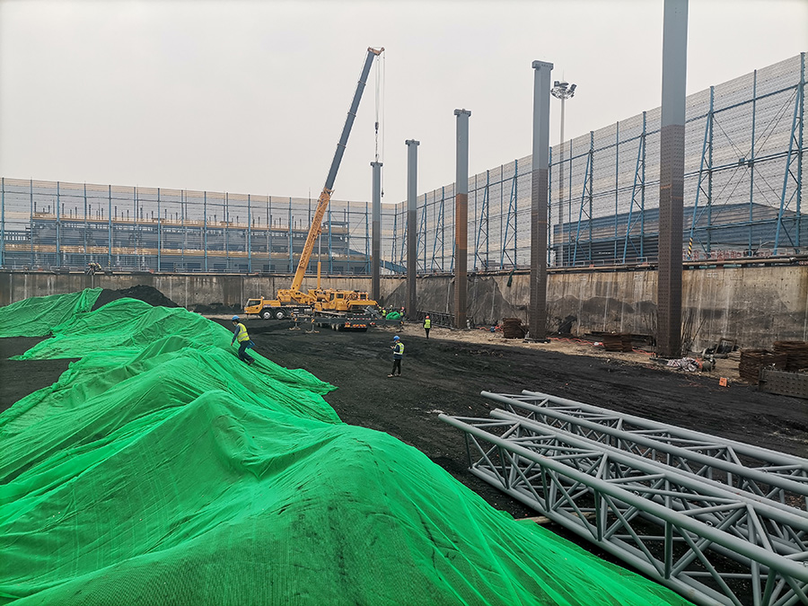 北海一電4*B60MW機組煤場封閉土建改造工程,位于濱州市北海新區(qū)馬山子鎮(zhèn),露天煤場南北方向長約153米,東西方向?qū)捈s102米,高度約12米。混凝土基礎(chǔ)為C40,墊層為C20素混凝土。本項目特點: