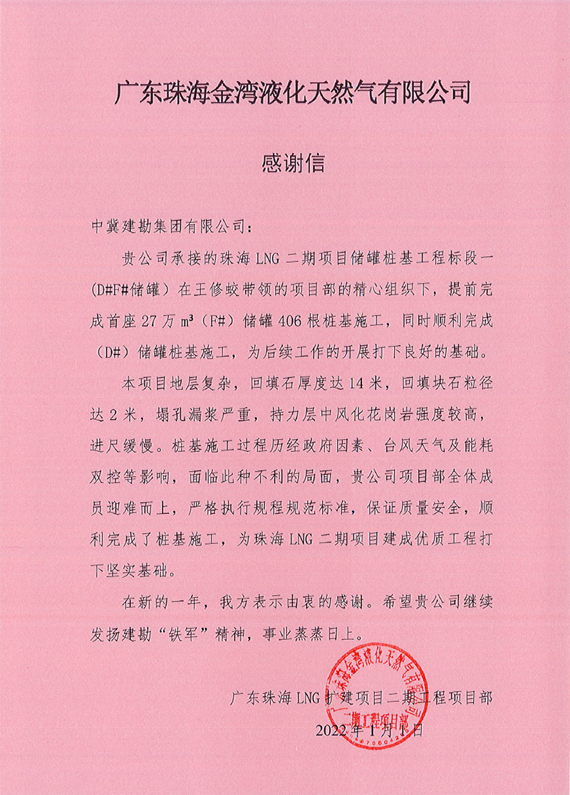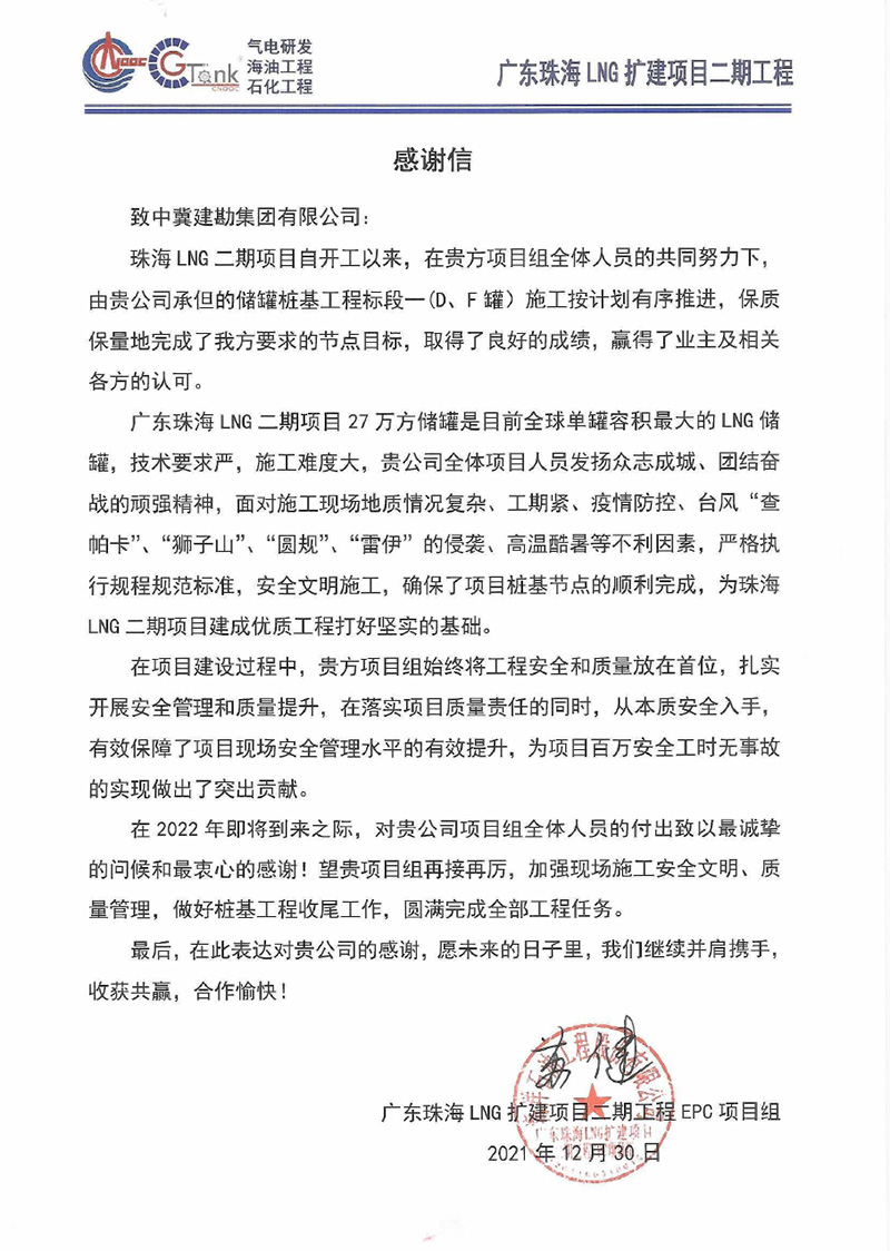 廣東珠海LNG二期項目27萬方儲罐是目前全球單罐容積最大的LNG儲罐,技術要求嚴,施工難度大。在施工工過程中,全體項目人員發(fā)揚眾志成城、團結(jié)奮戰(zhàn)的頑強精神,面對施工現(xiàn)場地質(zhì)情況復雜、工期緊、疫情防控、臺風“查帕卡”、“獅子山”、“圓規(guī)”、“雷伊”的侵襲、高溫酷暑等不利因素,迎難而上,頑強奮戰(zhàn),保質(zhì)、安全、高效地履行合同任務,確保了項目樁基節(jié)點的順利完成,為珠海LNG二期項目建成優(yōu)質(zhì)工程打好堅實基礎,為項目百萬安全工時無事故的實現(xiàn)做出了突出貢獻,受到業(yè)主及總包方的高度贊揚。