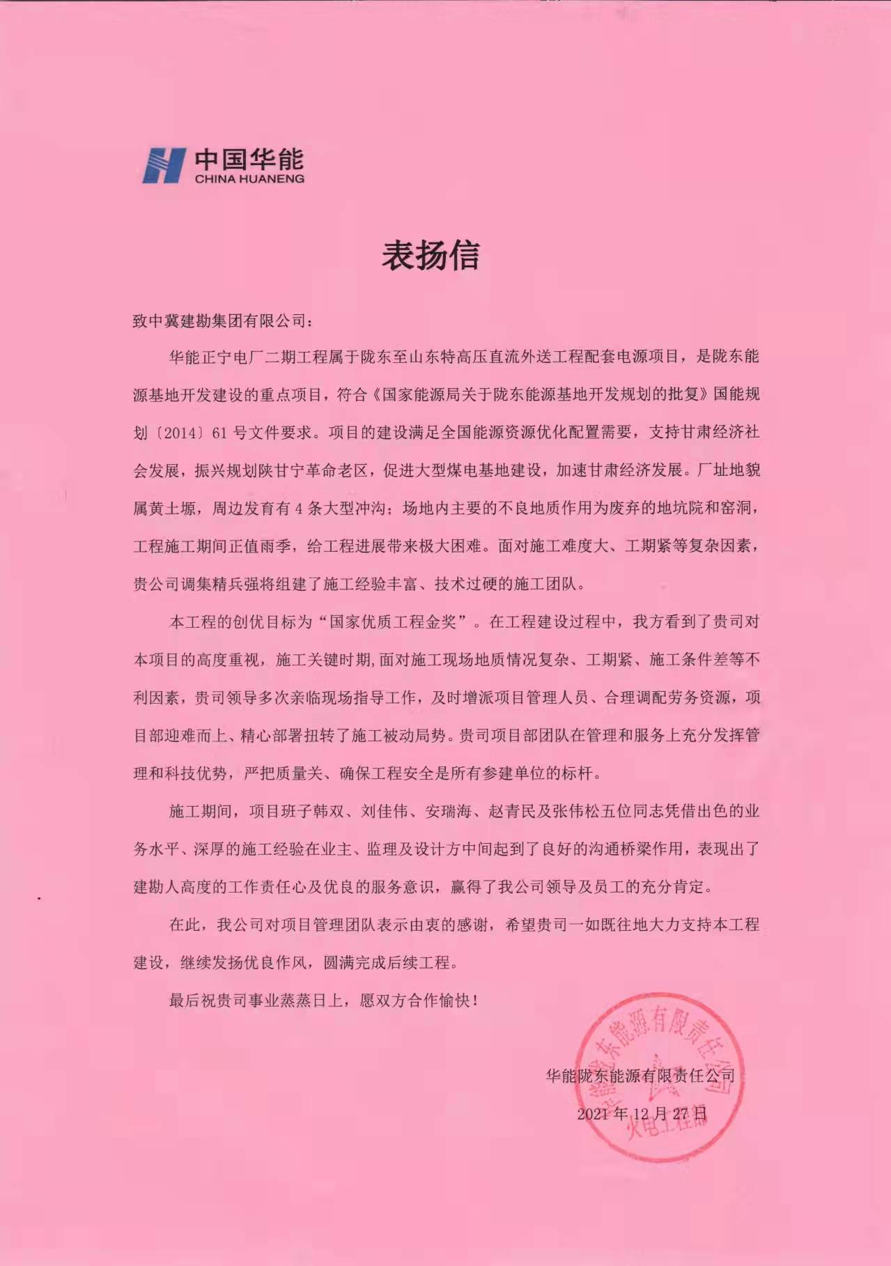 華能正寧電廠二期樁基工程屬于隴東至山東特高壓直流外送工程配套電源項(xiàng)目,是隴東能源基地開發(fā)建設(shè)的重點(diǎn)項(xiàng)目, 在工程建設(shè)過程中面對(duì)施工現(xiàn)場(chǎng)地質(zhì)情況復(fù)雜、工期緊、施工條件差等不利因素,項(xiàng)目部迎難而上、精心部署扭轉(zhuǎn)了施工被動(dòng)局勢(shì)。在管理和服務(wù)上充分發(fā)揮管理和科技優(yōu)勢(shì),嚴(yán)把質(zhì)量關(guān)、確保工程安全是所有參建單位的標(biāo)桿。其中項(xiàng)目部班子韓雙、劉佳偉、趙青民、安瑞海及張偉松五位同志憑借出色的業(yè)務(wù)水平、深厚的施工經(jīng)驗(yàn)在業(yè)主、監(jiān)理及設(shè)計(jì)方中間起到了良好的溝通橋梁作用,表現(xiàn)出了建勘人高度的工作責(zé)任心及優(yōu)良的服務(wù)意識(shí),收到業(yè)主及監(jiān)理的高度贊揚(yáng)。
