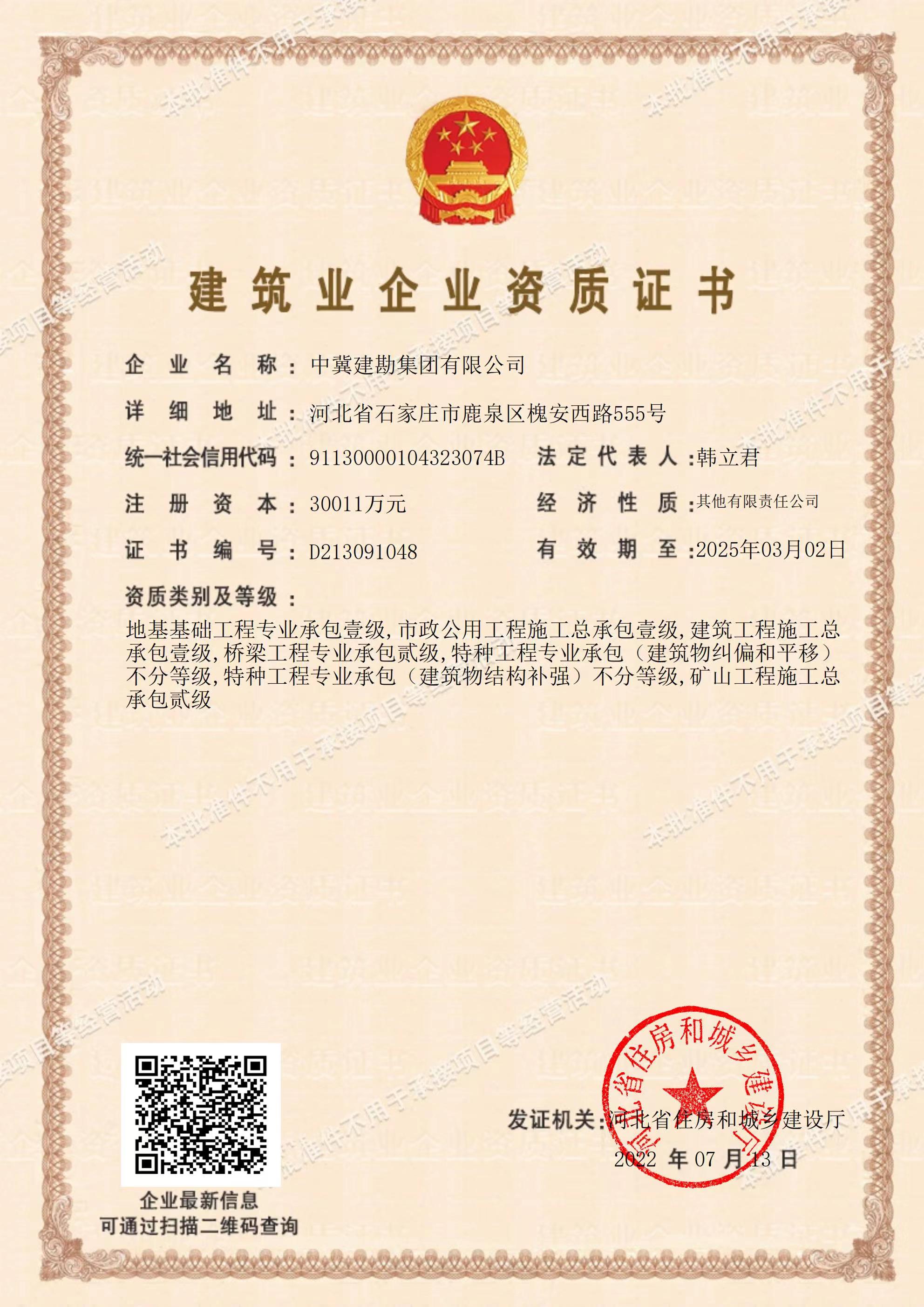 在集團公司領導的運籌帷幄下,經過近半年的不懈努力,集團公司于2022年7月13日喜獲建筑工程施工總承包壹級資質,該資質的取得將有力促進我公司建筑施工總承包業務開展,對公司轉型升級、地方市場開拓將起到重要作用,為公司持續穩定發展奠定更加堅實的基礎。