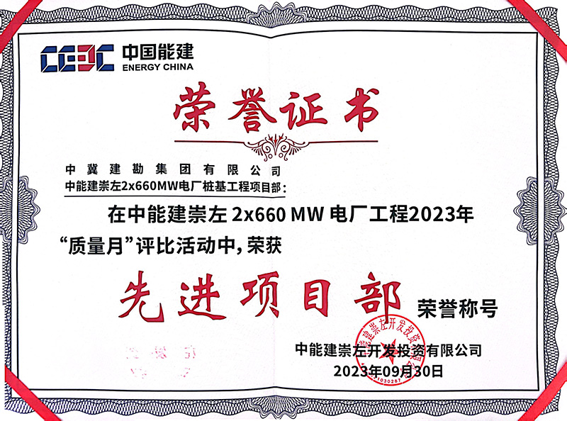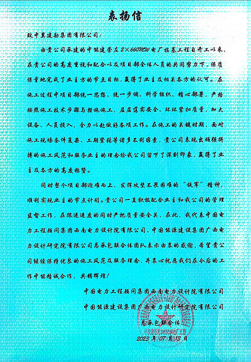 中能建崇左2×660MW電廠樁基工程,在施工過程中,項目部統一思想、統一步調、科學組織,精心部署,嚴格按照施工技術步驟與措施施工,層層落實安全,環環緊扣質量,加大設備、人員投入,全力以赴做好各項工作。全體員工以頑強拼搏的施工風范和服務業主的理念給我公司留下了深刻印象,贏得了業主及各方的高度稱贊。