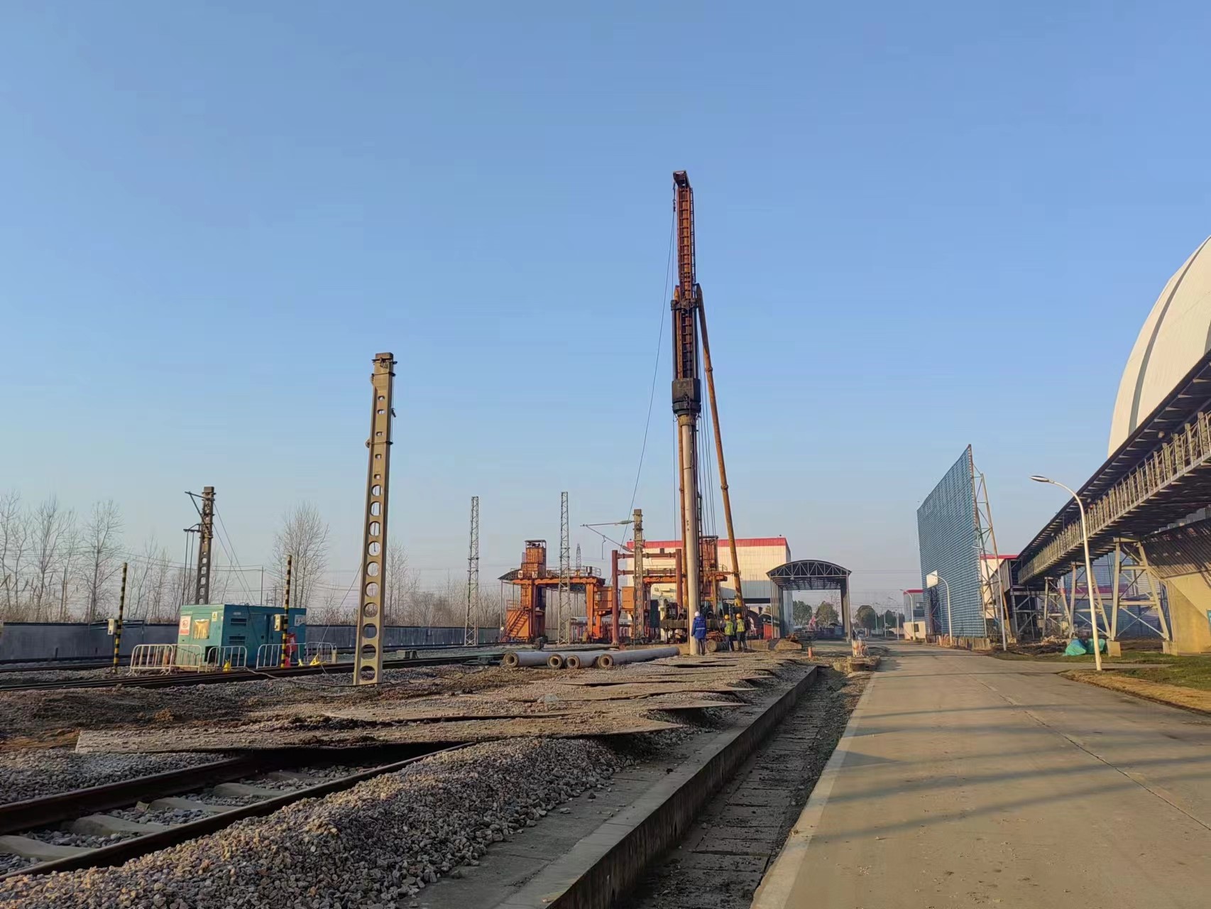 H2標段樁基工程于2023年7月11日開工, 2024年1月28日施工完成。本工程因施工區域較為分散,項目管理難度加大。為此,項目部積極與設計院就出圖順序進行溝通,提前籌劃安排行進方向的管樁原材料配備和現場道路鋪設、排水設施供應等后勤保障工作,保證樁機施工的連續性,確保了建設單位的工期時間要求。此外,管帶機施工區域位于三期電廠內,涉及10kV高壓線拆除、大棚拆遷、樹木移除、監控拆除、屏風拆除等工作。項目部積極與建設方協調溝通,全力推進施工區域內障礙物拆除和清理工作。因部分樁位在火車鐵軌上,項目部積極與鐵路方溝通,與建設方、監理方謀劃施工方案,采取相應措施,圓滿完成了施工任務。經第三方檢測,合格率100%。