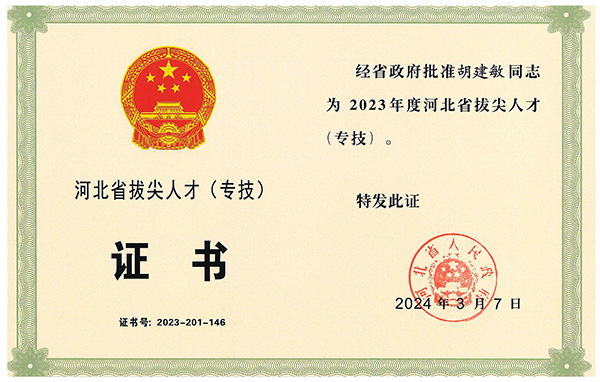 公司胡建敏同志榮獲2023年度河北省拔尖人才(專技)