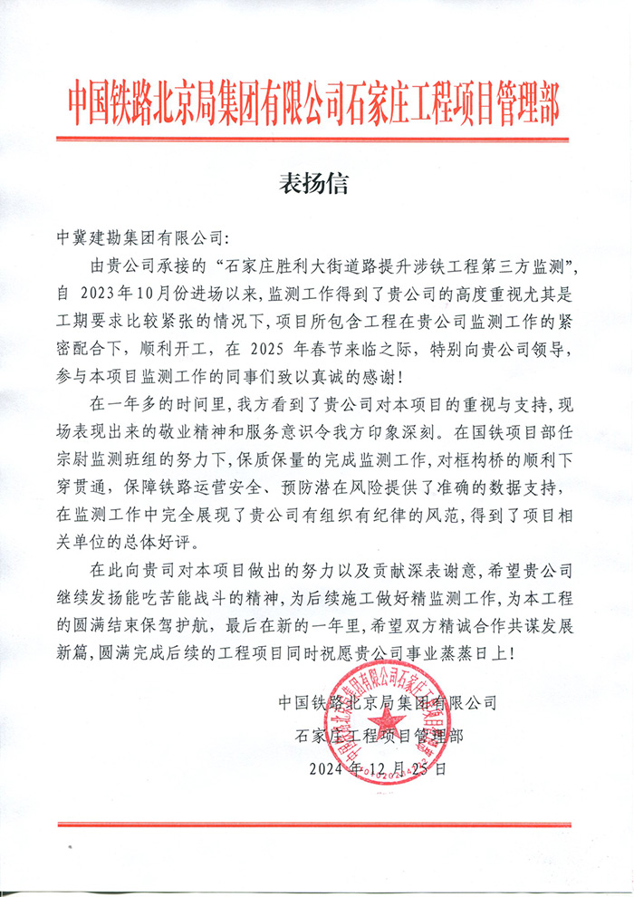 石家莊市勝利大街道路提升涉鐵工程鐵路設(shè)施安全監(jiān)測項目,六公司通過高精度的測繪和實時監(jiān)測,確保了鐵路設(shè)施的安全運營,贏得了中國鐵路北京局的高度評價。京石客專石家莊樞紐改造工程,我們的精準(zhǔn)監(jiān)測工作為工程的順利進(jìn)行提供了堅實的數(shù)據(jù)支持,獲得了中鐵六局的高度認(rèn)可和表揚。