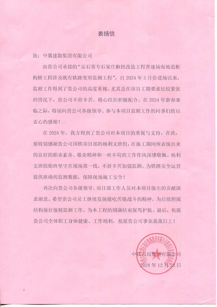 近期,集團(tuán)公司陸續(xù)收到中國鐵路北京局集團(tuán)有限公司、中鐵六局集團(tuán)有限公司、新疆兵準(zhǔn)信弘能源有限責(zé)任公司、任丘市供水有限公司發(fā)來的感謝信、表揚信以及優(yōu)秀合作單位榮譽獎牌、先進(jìn)工作者榮譽證書。
