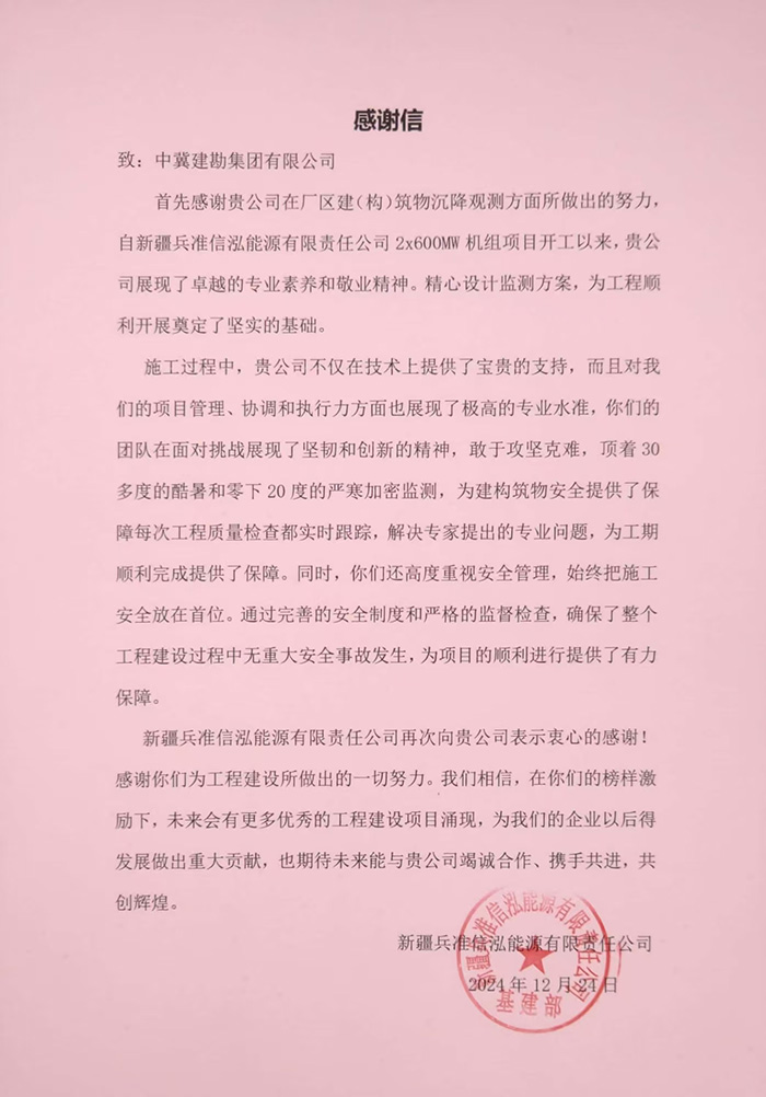 新疆昌吉兵準(zhǔn)信泓能源2x600MW機(jī)組沉降觀測項目,新疆項目部職工不畏嚴(yán)寒酷暑,頂著30多度的酷暑和零下20多度的極冷天氣加密監(jiān)測,為廠區(qū)建構(gòu)筑物安全提供了數(shù)據(jù)保障,每次工程質(zhì)量檢查都實時跟蹤,解決專家提出的專業(yè)問題,為工期順利完成提供了保障。業(yè)主單位特發(fā)來感謝信深表感謝!