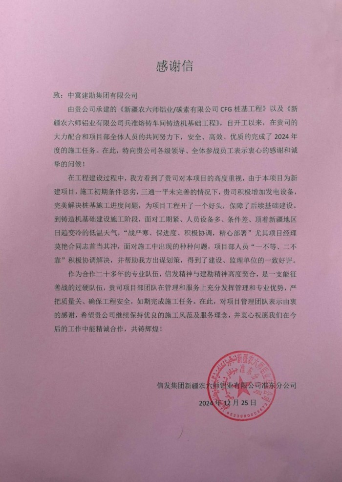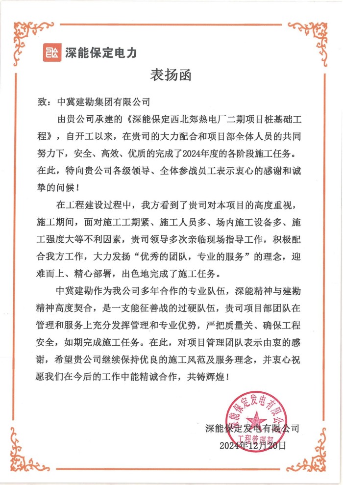 此外,我公司參與的新疆農六師鋁業CFG樁項目、內蒙古庫布齊沙漠鄂爾多斯中北部新能源基地光伏項目、深能保定西北郊熱電廠樁基礎工程等多個國內外項目收到業主單位表揚信,對我公司在項目中的高效執行、嚴謹管理和出色的團隊協作表示衷心感謝,并希望未來繼續與我公司保持緊密合作。