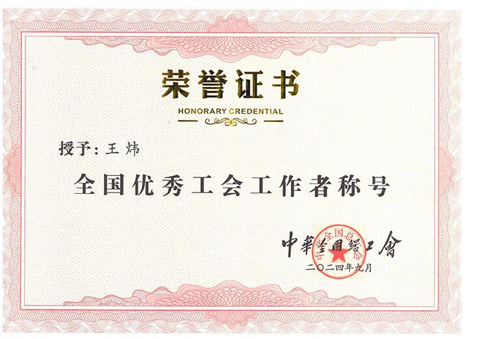 王煒同志榮獲中華全國總工會“全國優秀工會工作者”榮譽稱號