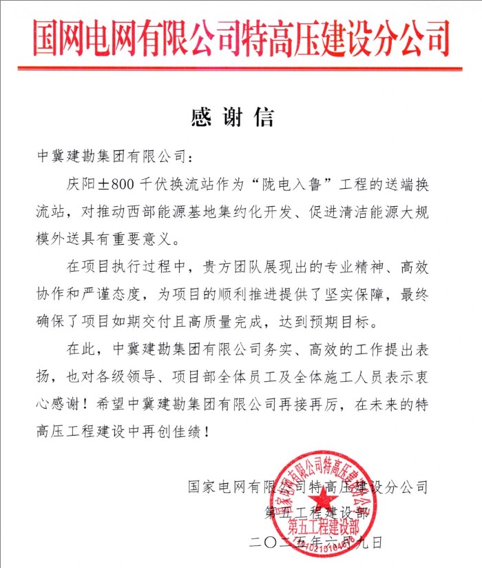 2025年6月9日,在±800千伏隴東-山東特高壓直流工程(簡稱“隴電入魯”)正式投運之際,我公司收到國家電網有限公司特高壓建設分公司對慶陽±800千伏換流站項目發來的感謝信。信中高度贊揚了我公司在項目執行過程中展現出的卓越專業精神、高效協作能力和嚴謹工作態度。