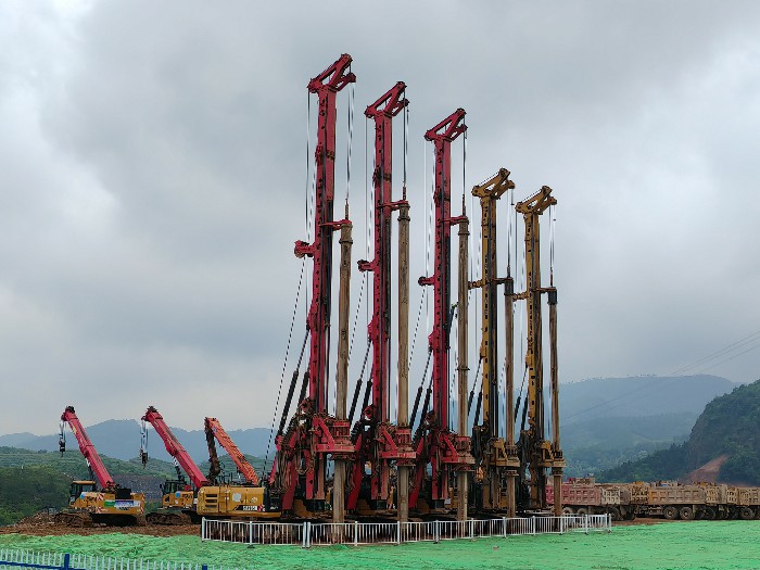 施工期恰逢當(dāng)?shù)赜昙荆鋮s塔區(qū)域地勢(shì)低洼、排水困難。項(xiàng)目團(tuán)隊(duì)提前開(kāi)挖排水溝、配備抽水泵、鋪設(shè)鋼板通道,實(shí)現(xiàn)雨天基本不停工。此外,場(chǎng)地為開(kāi)山回填區(qū),回填深度達(dá)10米且石塊巨大,導(dǎo)致鉆進(jìn)困難且混凝土充盈系數(shù)增大。項(xiàng)目團(tuán)隊(duì)?wèi)?yīng)用“長(zhǎng)護(hù)筒工藝”,利用插板機(jī)下設(shè)加長(zhǎng)護(hù)筒直接穿越回填石層,有效護(hù)壁并控制混凝土用量;針對(duì)大塊石,采用“黏土回填慢鉆”法輔助成孔。