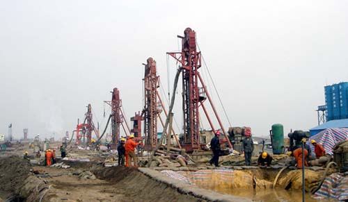 工程地點(diǎn)位于武漢市天興洲。施工時(shí)間2005年1月至2006年4月。引橋7#、9#、10#、11#墩,樁徑1.5m、樁長65-70m,72根,樁端嵌入弱膠結(jié)泥質(zhì)礫巖近30m,巖石強(qiáng)度14MPa。01#-09#φ2.5m鉆孔,樁長65-75m,95根樁端嵌入強(qiáng)膠結(jié)泥質(zhì)、鈣礫巖約40m,巖石強(qiáng)度20-60MPa,施工難度極大。