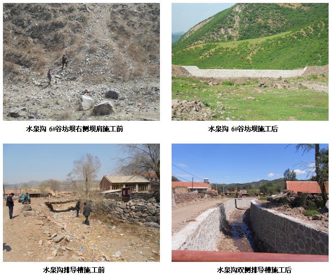 本治理工程施工時間為2013年5月8日-2013年9月10日,包括水泉村范圍內水泉溝、王小溝兩條溝谷,主要施工項目為谷坊壩、排導槽、擋墻工程,其中水泉溝內包括6道谷坊壩,PM2坡面護腳擋墻,水泉溝單側排導槽(0~249.3m),水泉溝雙側排導槽(0~708.6m),王小溝內包括道谷坊壩7道,王小溝單側排導槽(0~271.2m),王小溝雙側排導槽(0~372m)。